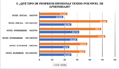 En cuanto a la experiencia de aprendizaje del español con profesores nativos y no nativos, el gráfico refleja el tipo de profesor que tienen y/o han tenido los estudiantes por nivel acorde a su nacionalidad: checa (CH) y eslovaca (ESL). En sus experiencias se recogen todos los contextos educativos por los que han pasado hasta llegar a la universidad; es decir, las clases de español que hayan podido tener en educación primaria, secundaria y universitaria hasta la fecha de responder al cuestionario.