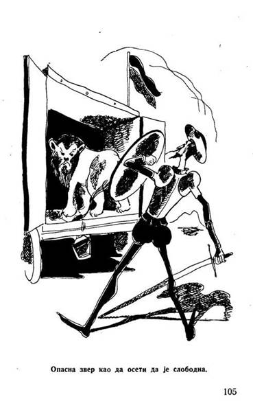 Sin embargo, once años más tarde, durante la ocupación alemana de Belgrado (1942), la casa Jugoistok, heredera de Geca Kon, judío asesinado por los nazis, decide imprimir la misma adaptación, pero cambiando los dibujos de Žedrinski por ilustraciones de otro artista, perteneciente al mismo círculo. Djuka Janković (1894-1974) era pintor, ilustrador y uno de los mejores autores serbios de cómics antes de la Segunda Guerra Mundial. Era colaborador en el suplemento para niños de la revista Vreme (“Tiempo”) y en varias gacetas para los más jóvenes, como Mika Miš (“Mickey Mouse”) y Vrabac (“El gorrión”)7. Creó cómics adaptando varias obras literarias y cuentos fantásticos (de Nušić, Sremac). Su aproximación a la novela cervantina se resume en cinco escenas, también en blanco y negro y a toda página8. A esta serie es necesario añadirle la portada, del mismo autor, en la que vemos a don Quijote volando por los aires en el aspa del molino. Los grabados de Janković están realizados en pluma y tinta, con trazado seguro.
