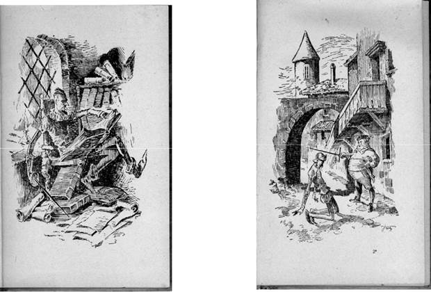 9 1. DQ leyendo en su biblioteca (blanco y negro, una página). 2. DQ a caballo (color; una página). 3. DQ y Sancho, a pie, conversando (blanco y negro, una página). 4. La aventura de los molinos, a color, dos páginas. 5. Embestida de DQ contra los carneros. Blanco y negro, una página. 6. DQ en la venta, hiriendo las botas de vino, a color, una página. 7. DQ y Sancho alejándose en sus monturas, de espaldas; una página, blanco y negro.